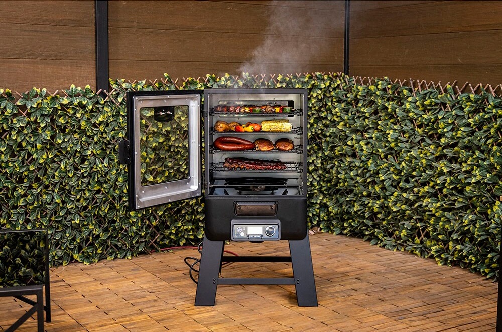 When you want to smoke a bunch of meat at once, I don’t think there’s a better option than a vertical smoker. Their cabinet shape and multitude of shelves are perfect for optimizing space.